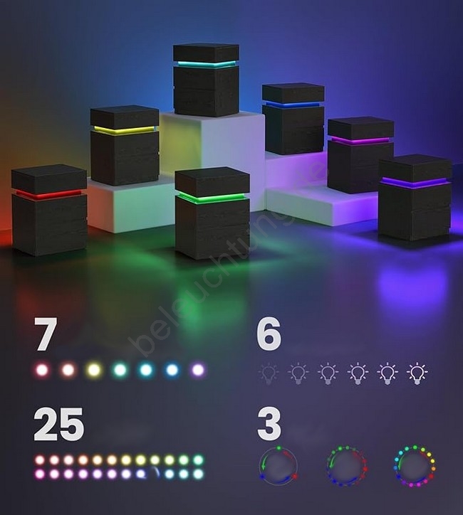 • LED-Beleuchtung in 25 Farben, 6 Helligkeitsstufen, 10 Modi und 6 Blinkfrequenzen.