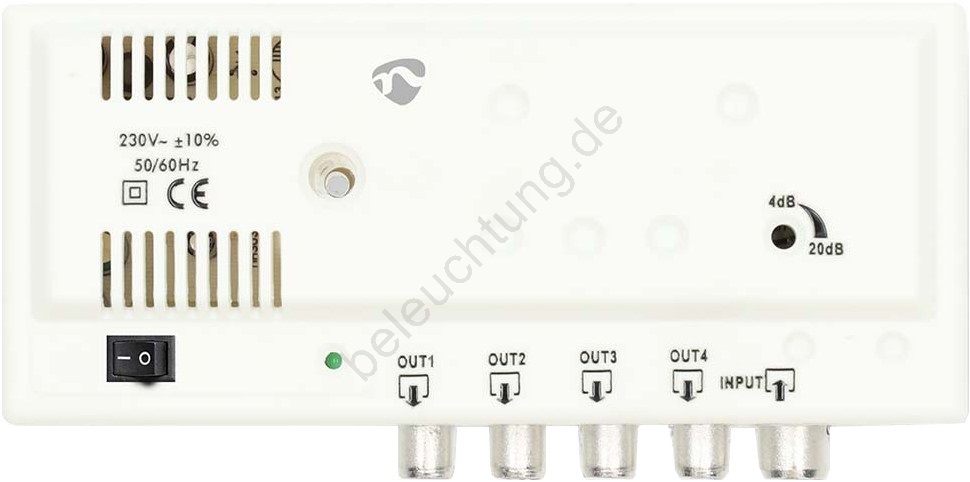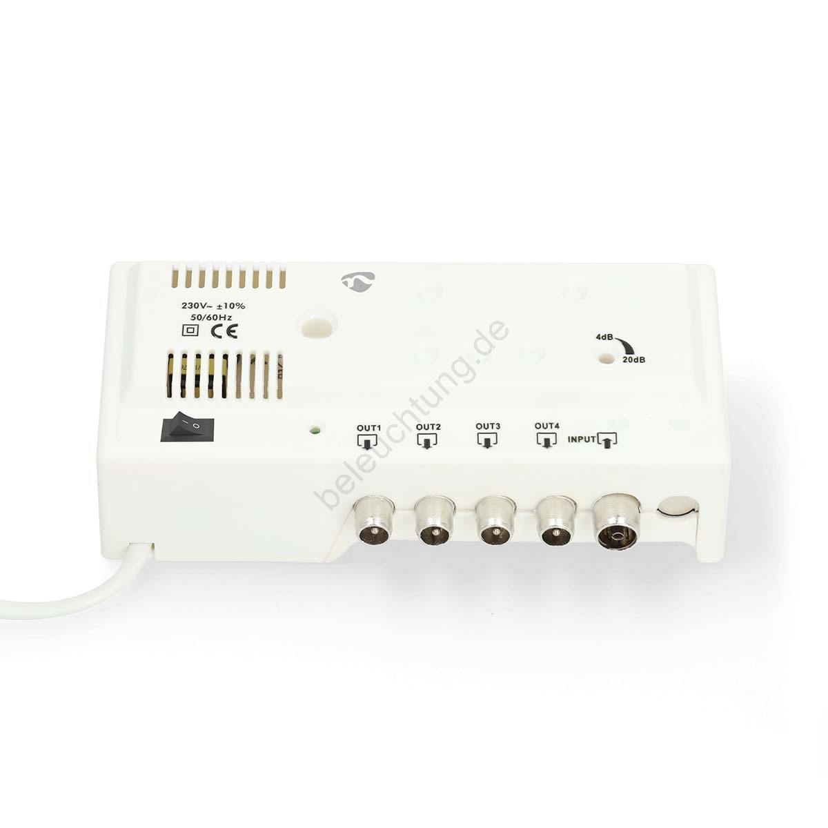 • 4‑Band-Zimmer-Antennenverstärker (20 dB) für den Anschluss von vier Empfangsgeräten (TV/Radio).