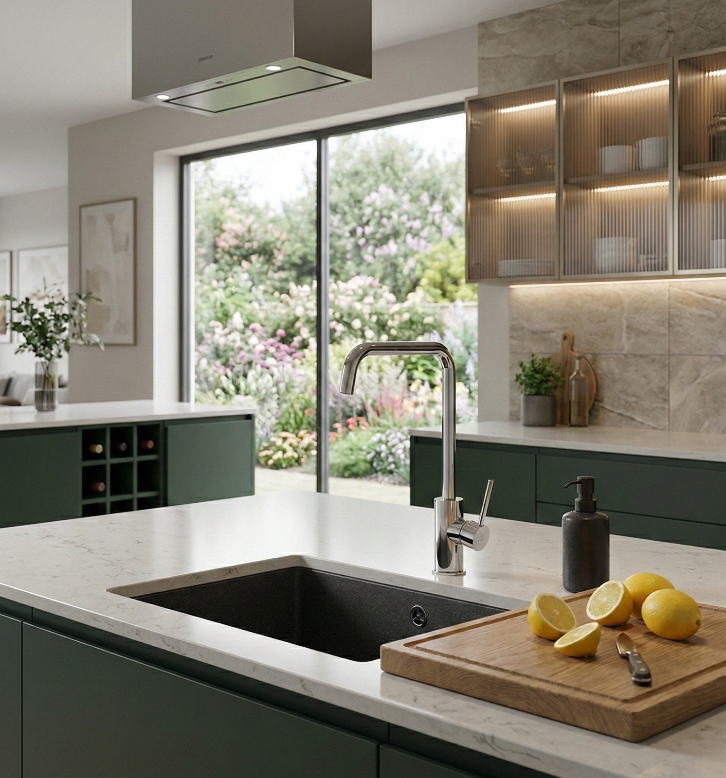 • Einhebel-Küchenarmatur zur Deckmontage am Spülbecken.