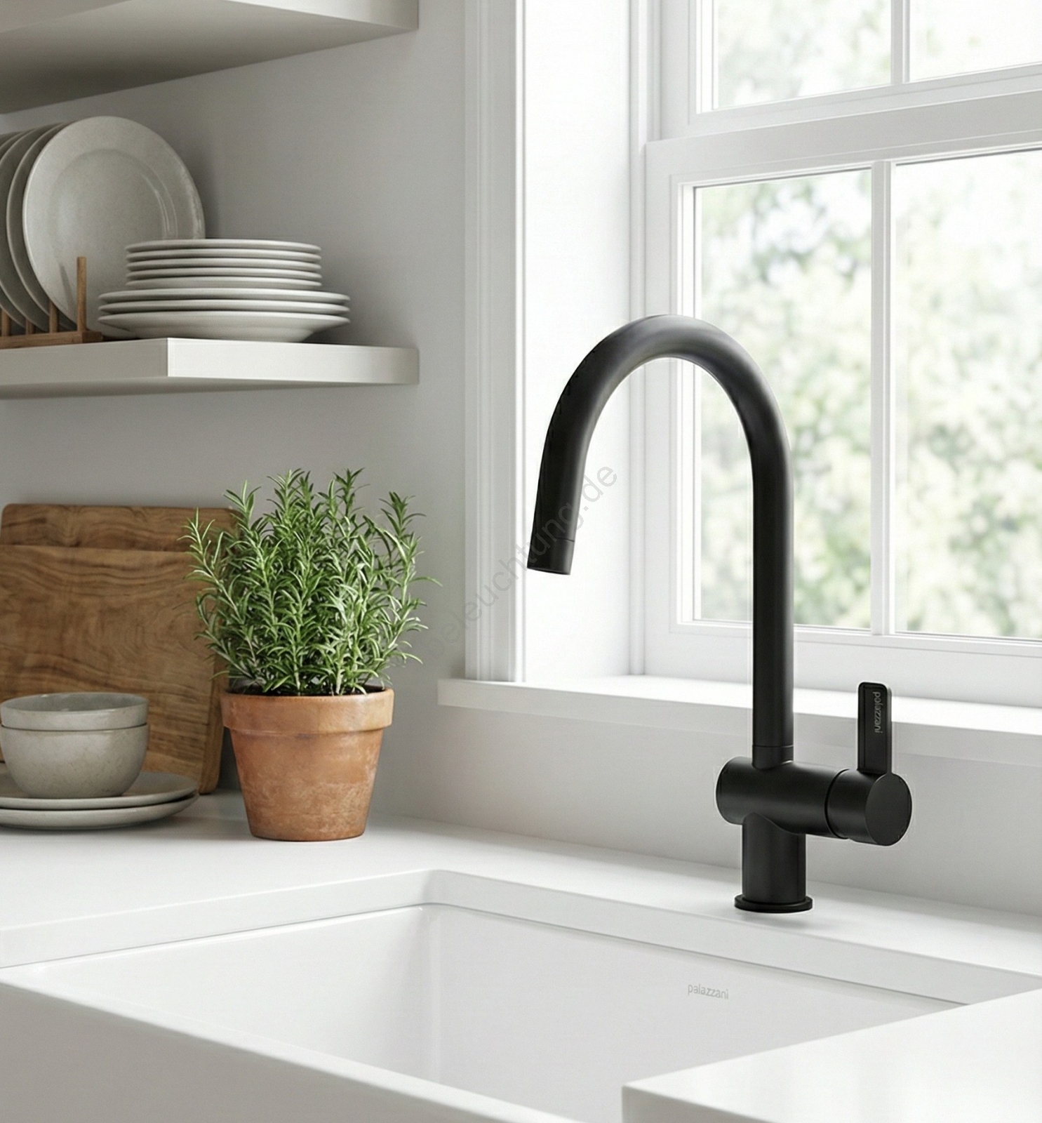 • Moderne Küchenarmatur in elegantem mattem Schwarz.