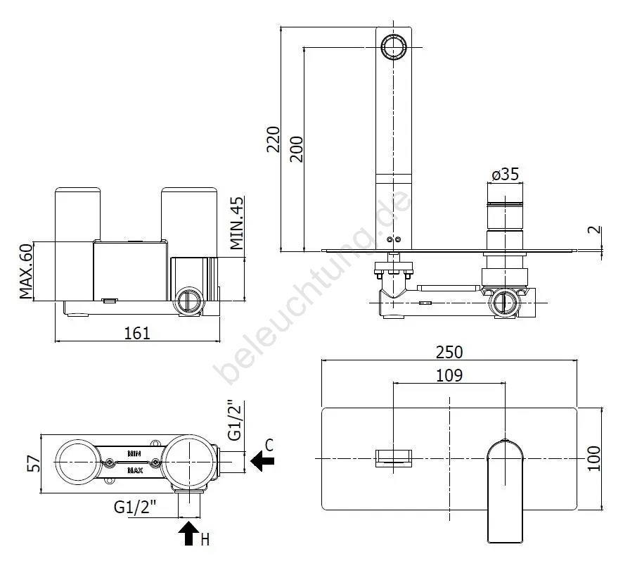 • Bei dieser Waschtischarmatur handelt es sich um eine für Unterputzmontage konzipierte Armatur.