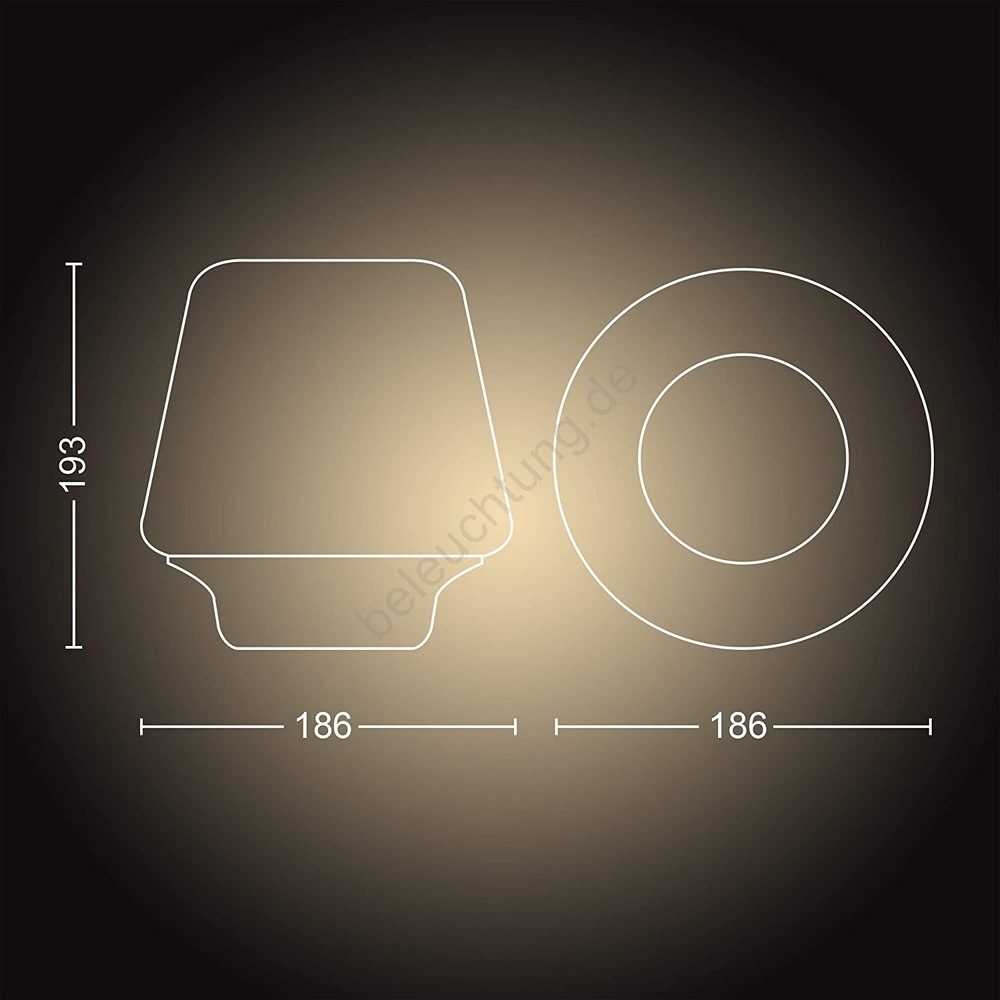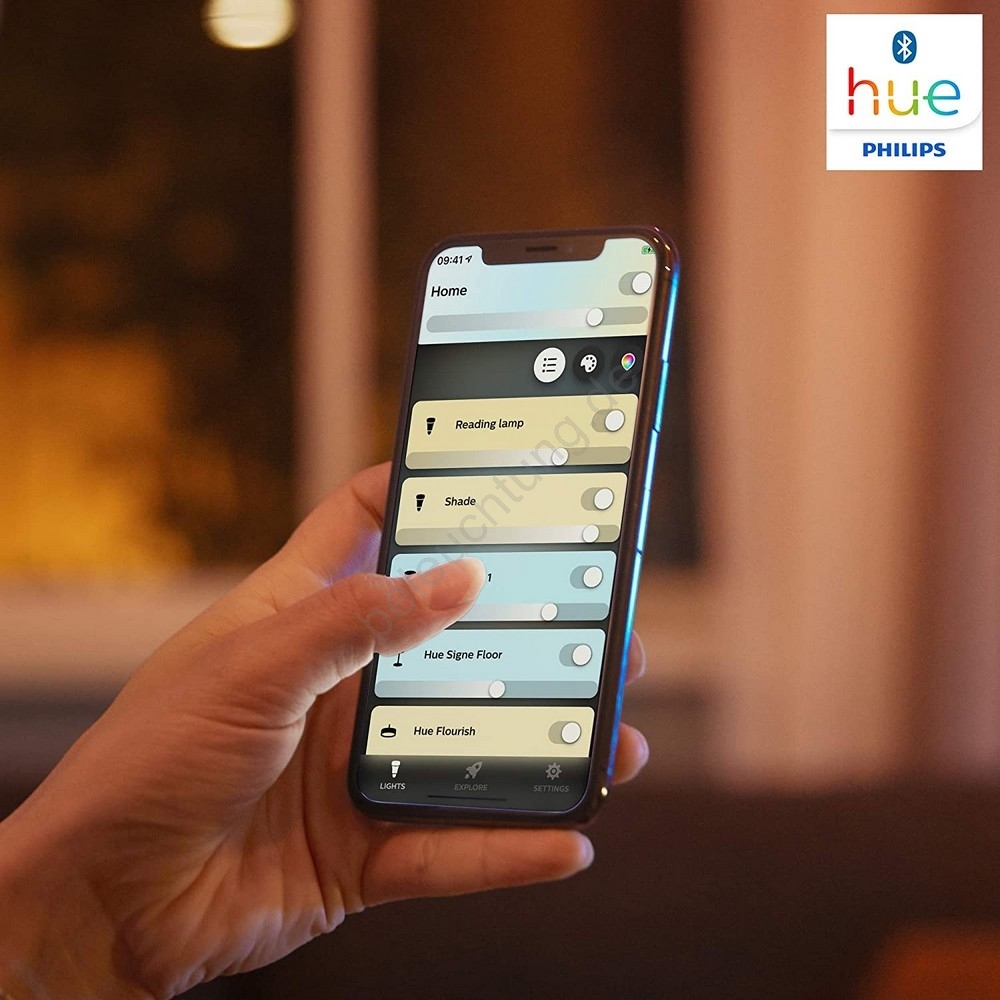 • Das Licht können Sie direkt über den beiliegenden Schalter mit Dimmer Hue oder per Bluetooth steuern.
