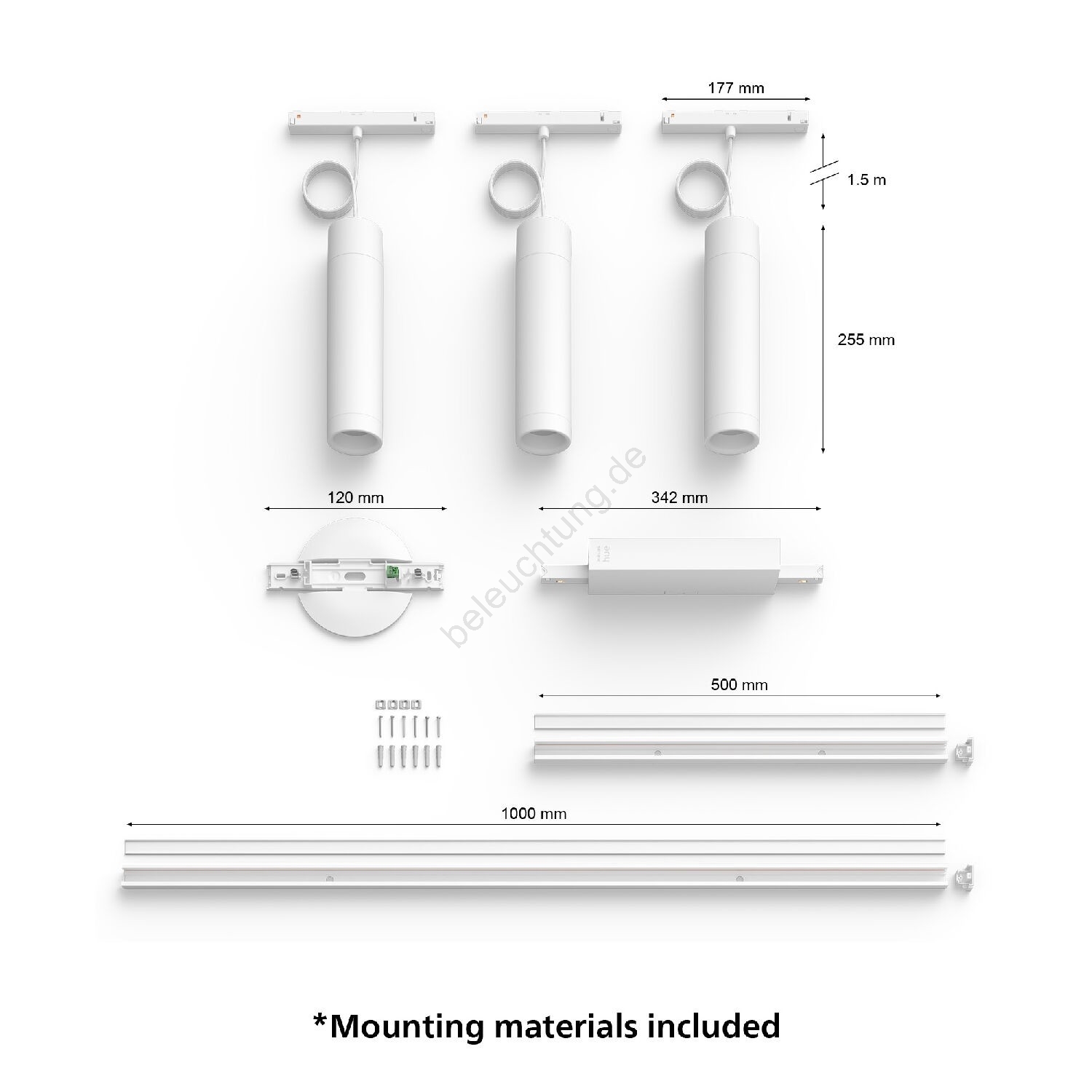 • Die Verpackung enthält: 3x Pendelleuchten, 1x 1m Schiene, 1x 0,5m Schiene und Netzteile, die zwischen den beiden Schienen platziert sind.