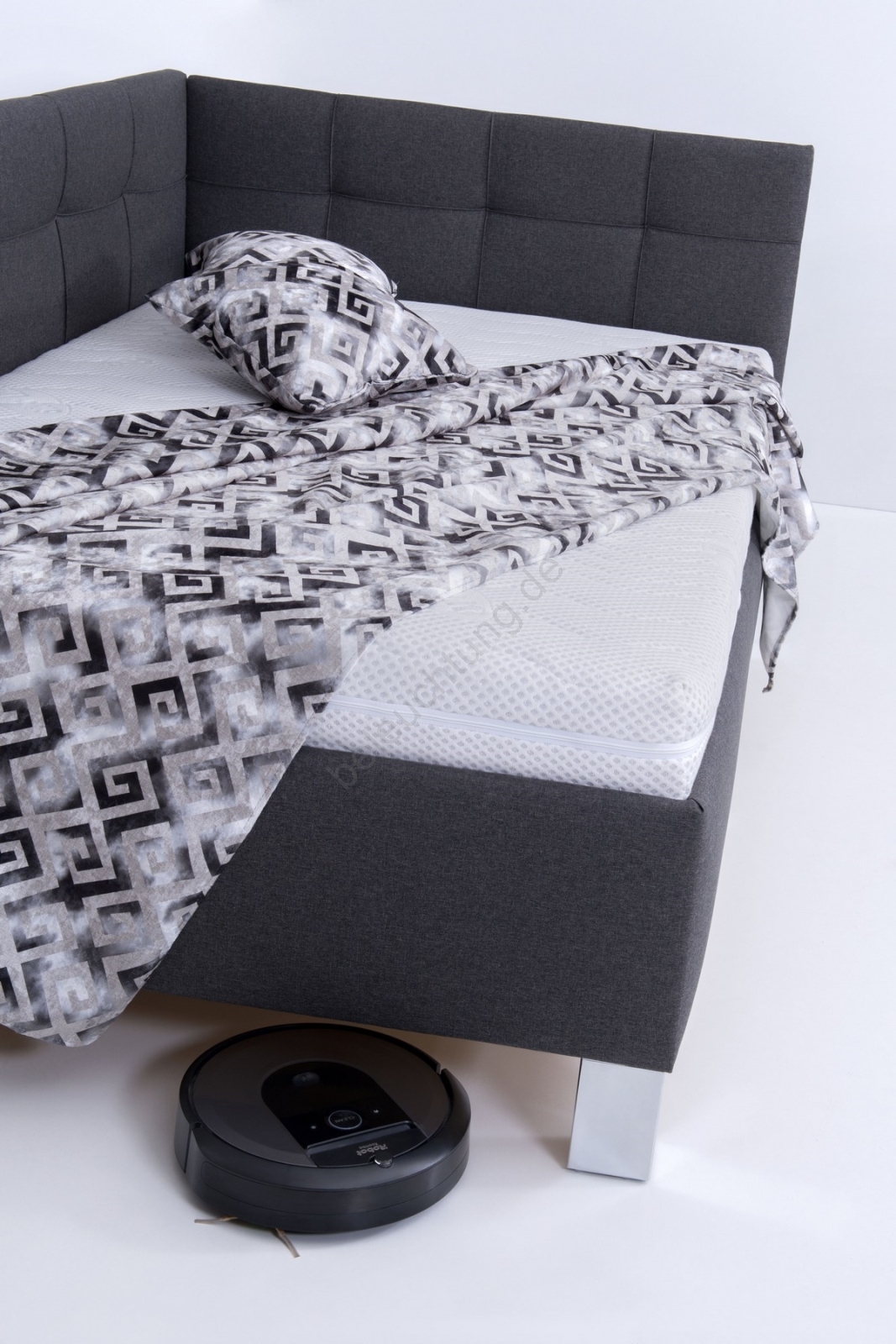 • Stabile und designorientierte Beine aus Chrom, 15 cm hoch, unterstreichen nicht nur das moderne Erscheinungsbild des Bettes, sondern ermöglichen auch eine einfache Reinigung ohne Probleme auch mit Unterstützung eines Saugroboters.