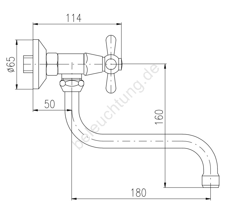 • Wandmontierte Mischbatterie für Spüle und Waschbecken mit rundem Auslauf.