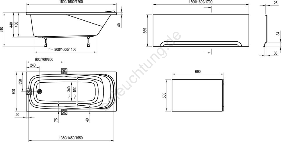 • Die Wanne kann mit einer Frontverkleidung versehen werden; diese ist nicht im Lieferumfang enthalten und separat erhältlich.