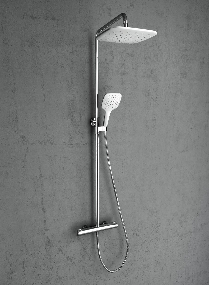 • Die Duschsäule Termo ist ein verschiebbares Set mit thermostatischer Armatur in glänzendem Chrom und weißer Kopfbrause.