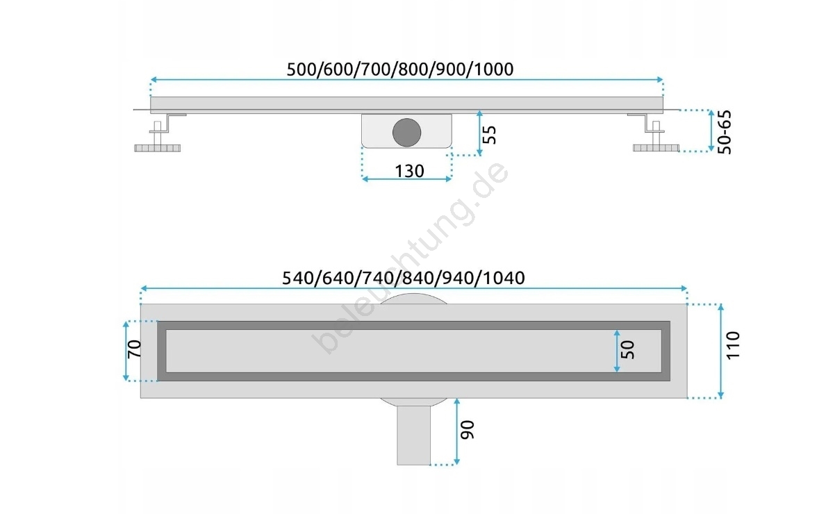 • Dank höhenverstellbarer Füße (50–65 mm) lässt sich der Ablauf leicht an unterschiedliche Bodenhöhen anpassen.