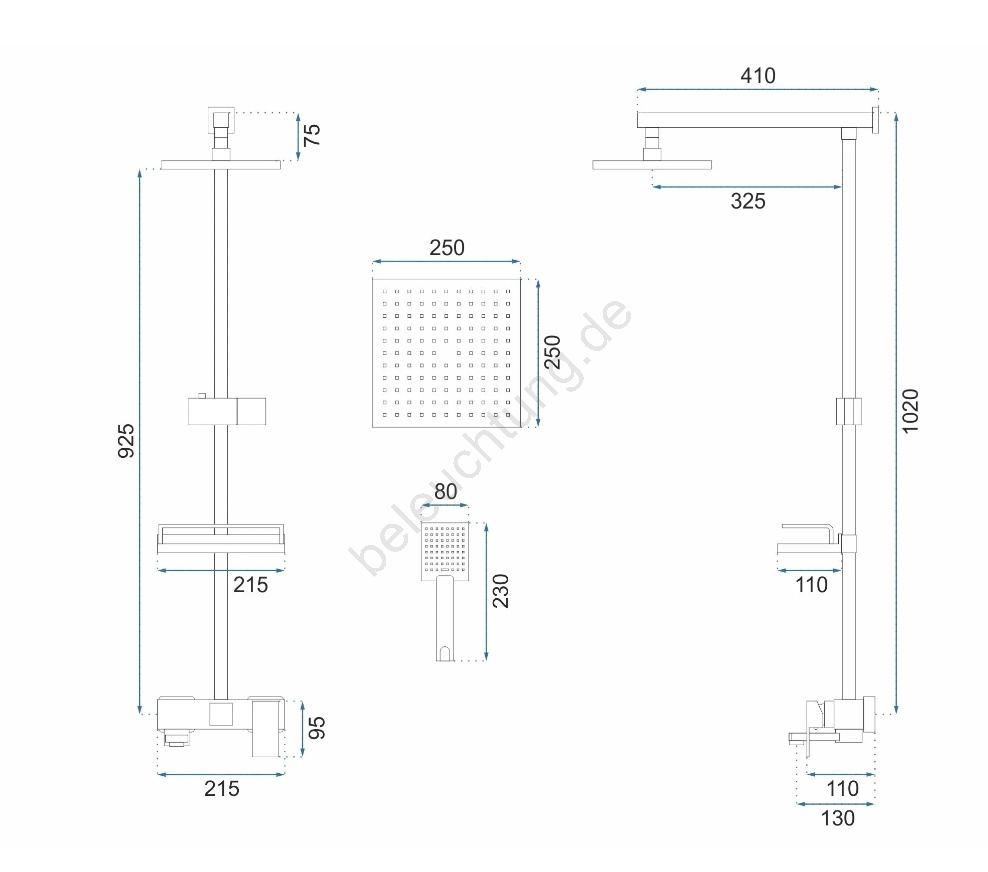 • Lieferumfang: Hand- und Kopfbrause, Halter für Handbrause, Seifenschale, Armatur mit Kartusche und 150 cm Schlauch.
