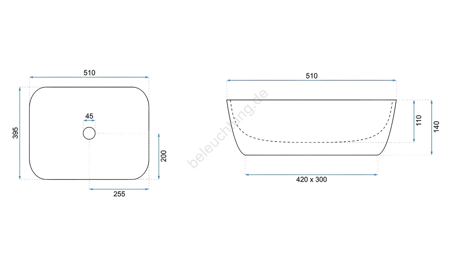 • Modernes und elegantes Waschbecken ohne Überlauf.