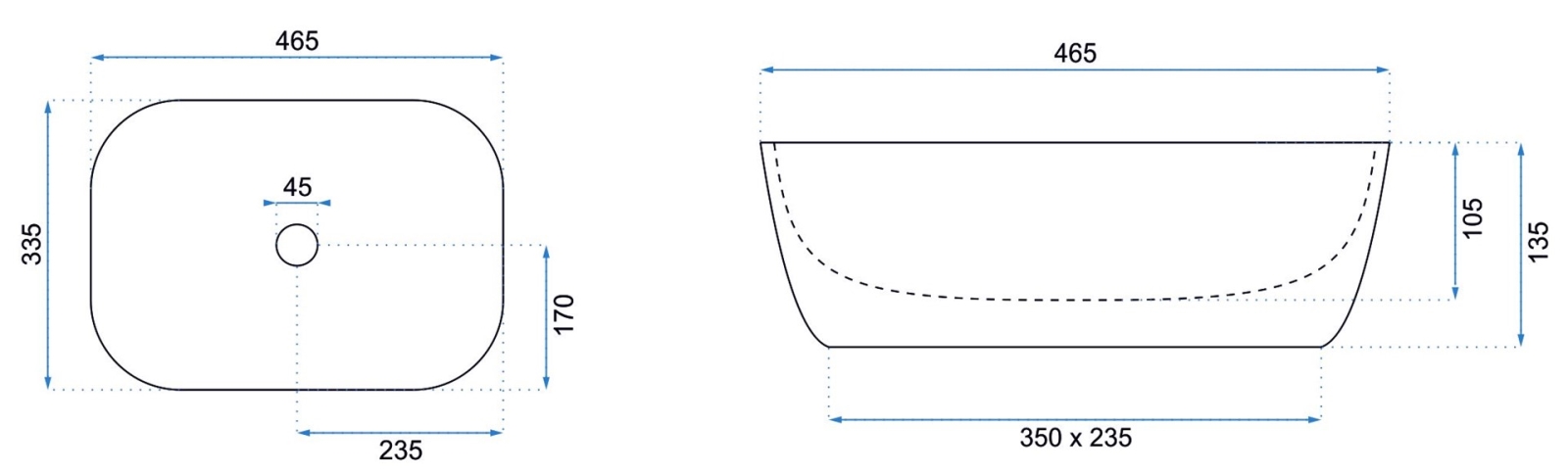 • Modernes und elegantes Waschbecken ohne Überlauf.