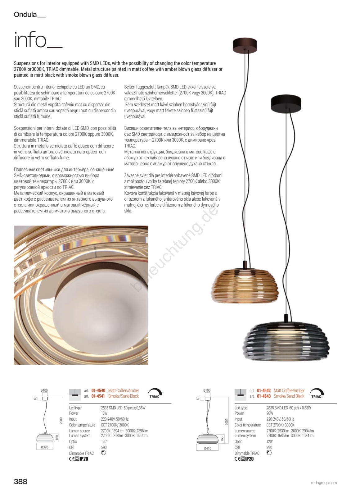 • Redo 01-4542 - Dimmbare LED-Pendelleuchte an Stahlseil ONDULA LED/16W/230V 2700K/3000K CRI 90 Ø 41 cm beige/rauchfarben