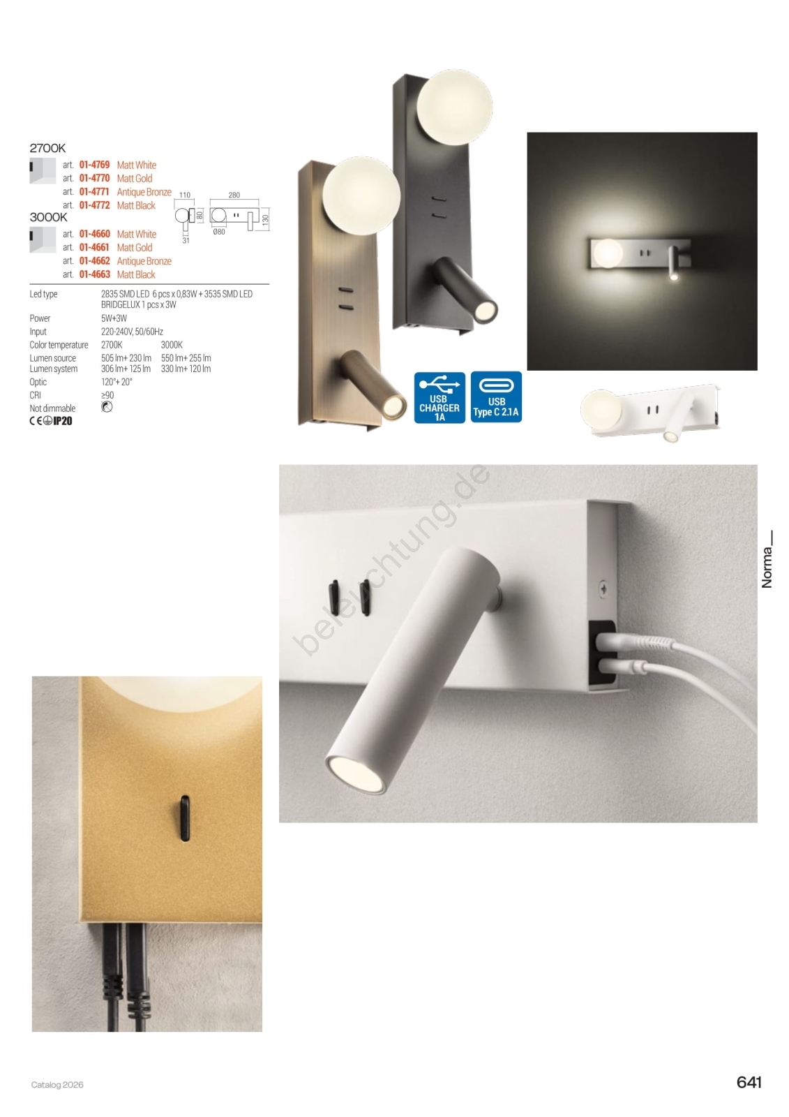 • Redo 01-4660 - LED-Wandleuchte NORMA LED/5W/230V + LED/3W CRI 90 USB weiß