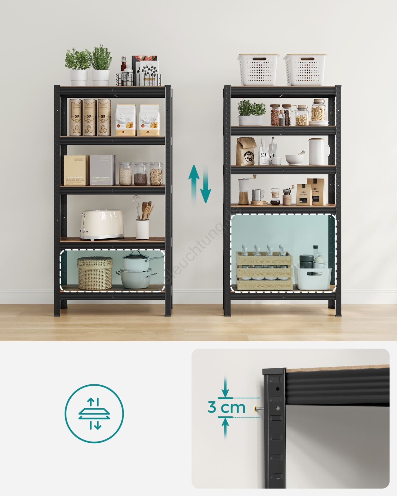 • Das Regal lässt sich aufteilen in zwei separate niedrige Regale, eine Einheit in der Küche als Untergestell für Backofen und Mikrowelle platzieren, die andere im Arbeitszimmer zur Aufbewahrung von Büchern, Pflanzen, Drucker und weiteren Gegenständen.