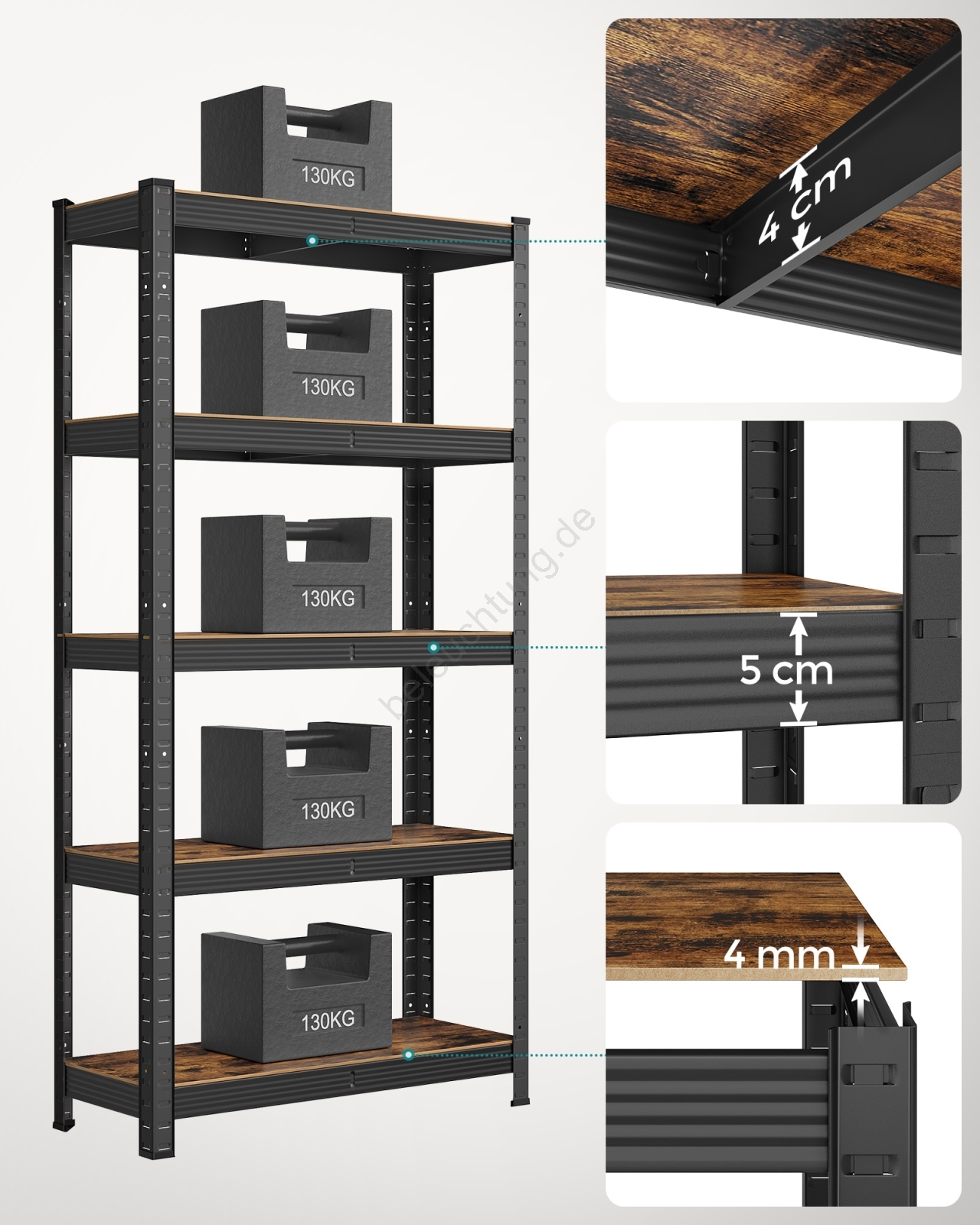 • Jeder Regalboden trägt bis zu 130 kg und eignet sich sicher zur Lagerung von Farben, Werkzeug und Fitnessgeräten.