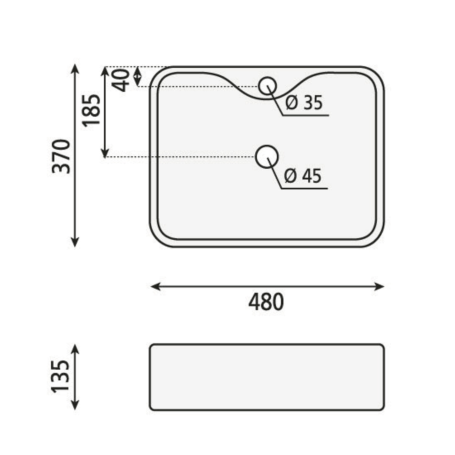 • Seine Maße sind 480x370 mm und die Form ist rechteckig.