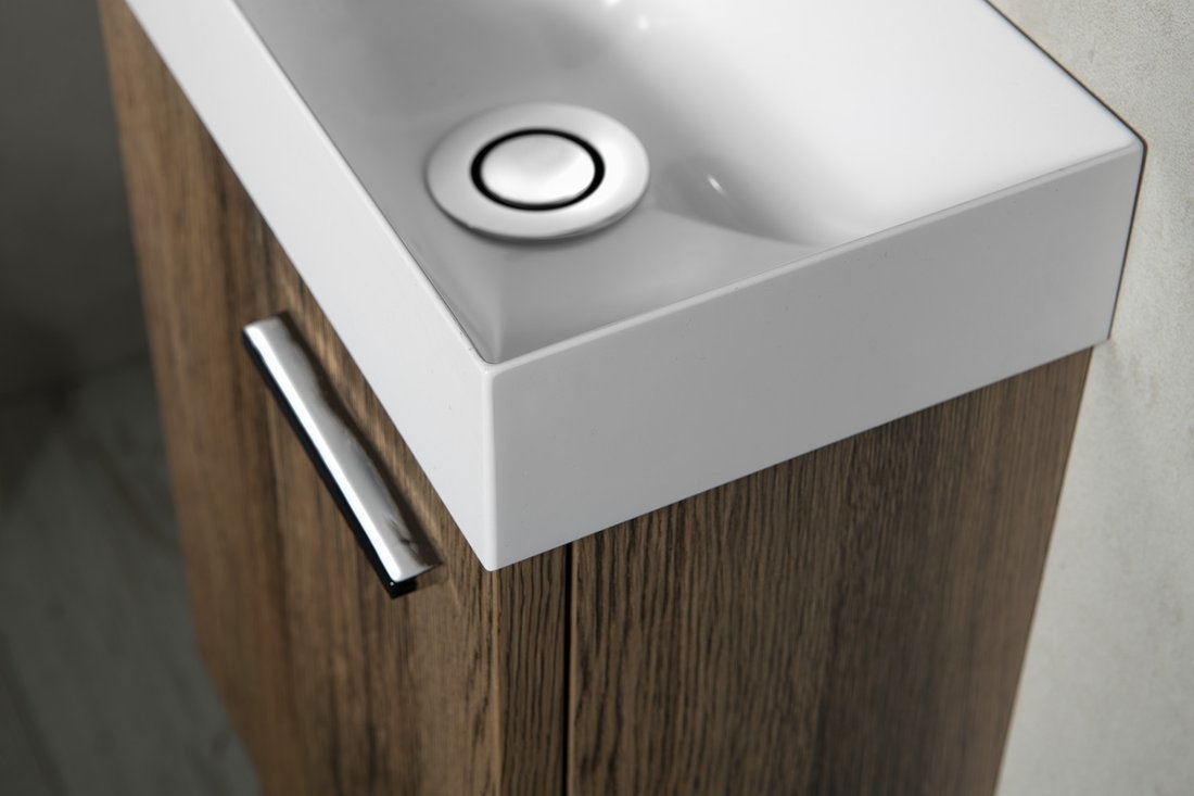 • Es ist zur Wandmontage vorgesehen und verfügt über eine linksseitige Bohrung für die Armatur.