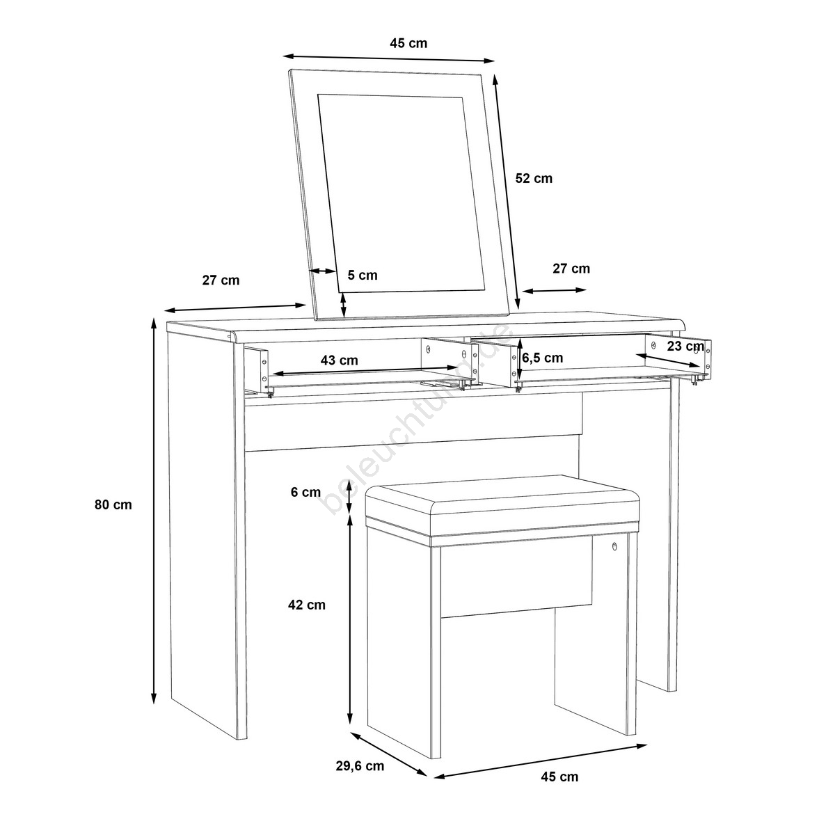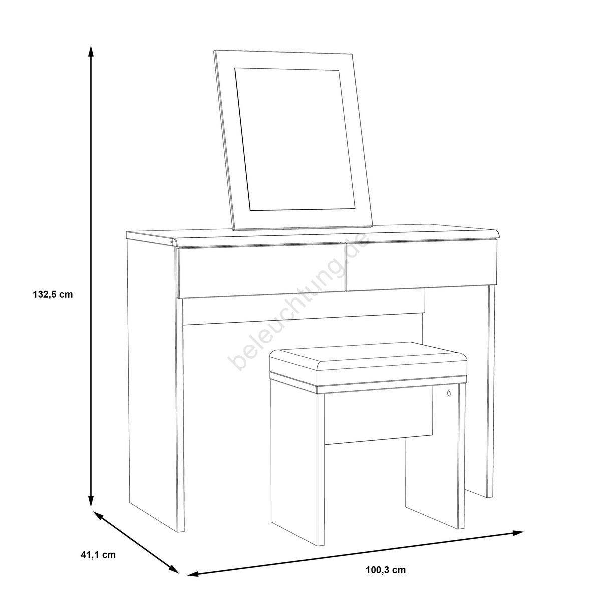 • Er verfügt über zwei Schubladen, die Ihnen reichlich Stauraum für Kosmetik und weitere Utensilien bieten.