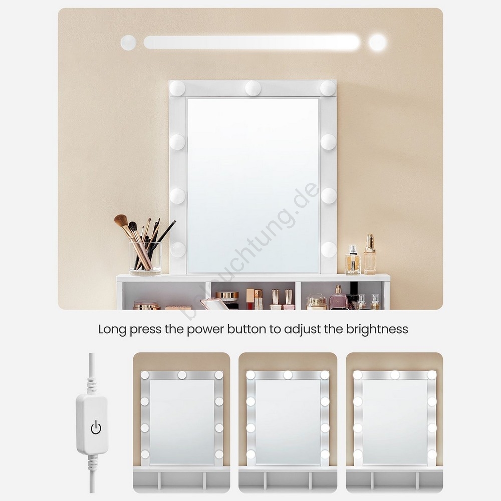 • Verfügt über 9 dimmbare LED-Leuchtmittel rund um den Spiegel.
