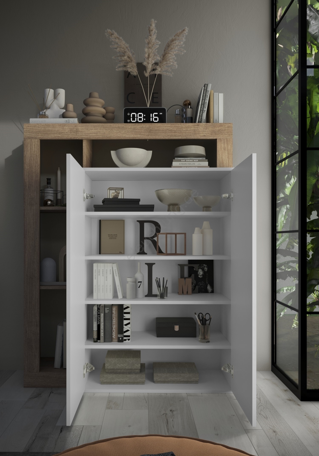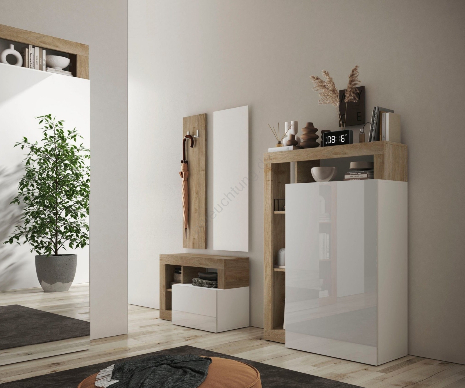 • Verfügt über 4 offene Regalböden sowie 5 Innenfächer zur Aufbewahrung von Taschen, Schuhen und saisonalen Gegenständen.