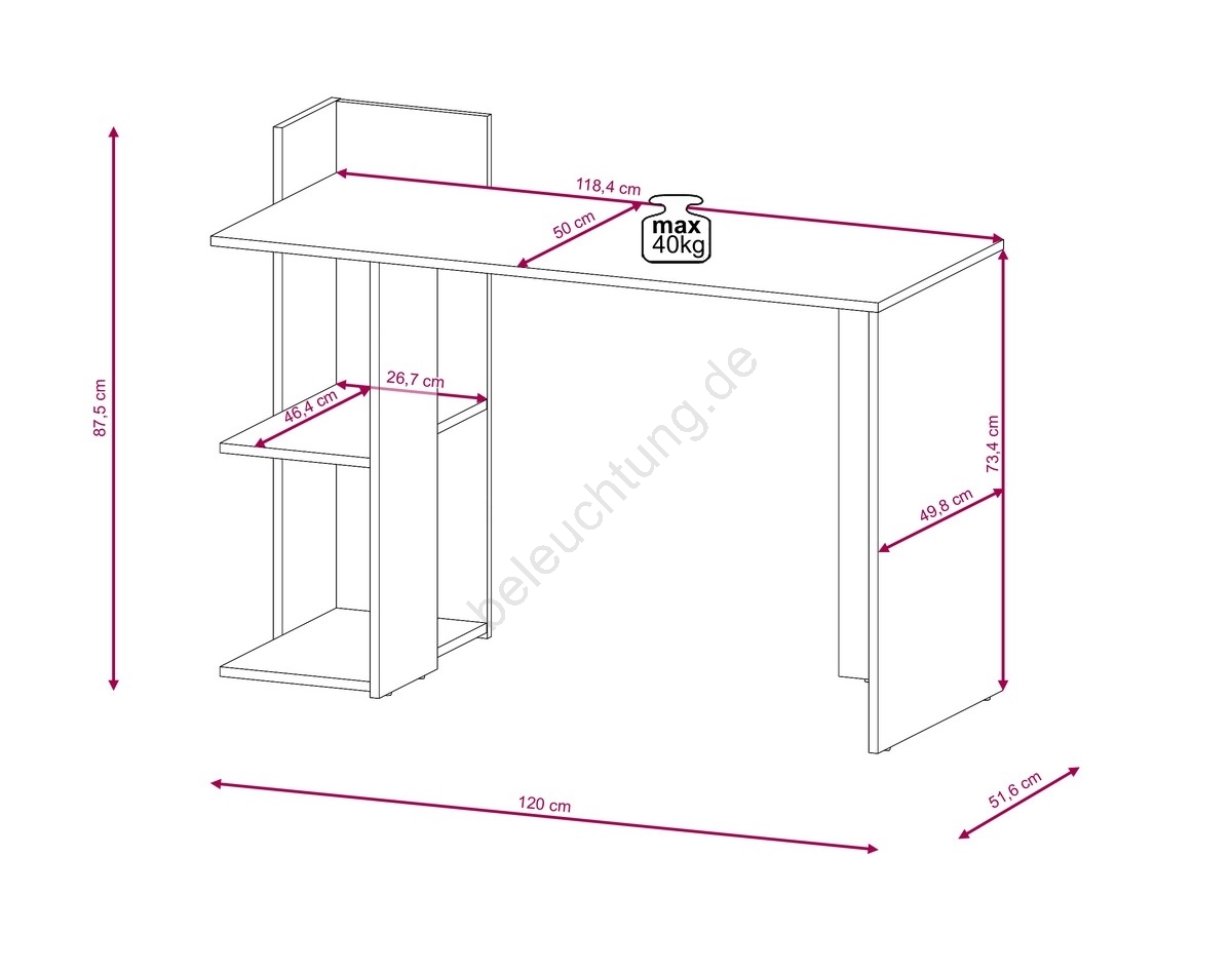 • Die rechteckige Arbeitsfläche ruht auf einer seitlichen Ablage mit zwei offenen Fächern, ideal zur Aufbewahrung von Büchern, Bürobedarf oder Dekorationen.