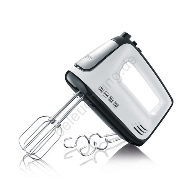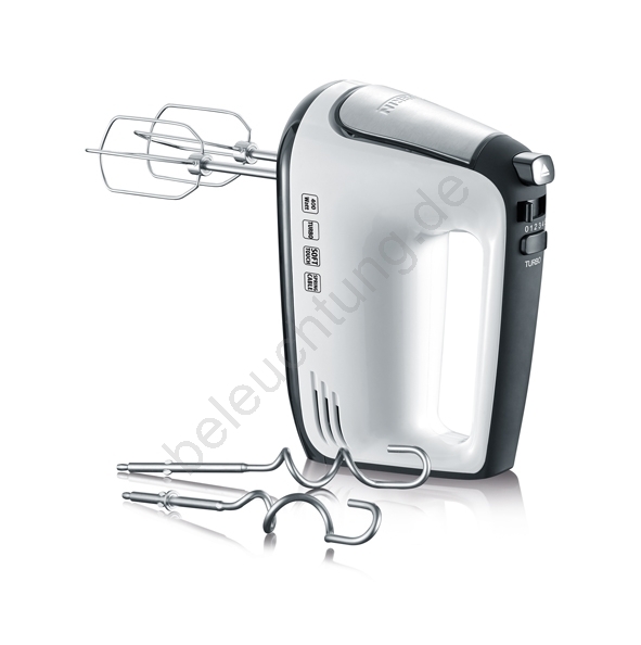 • Der Handmixer im modernen Weiß-Schwarz-Design mit Edelstahlelementen ist ein leistungsstarker Helfer für effektives Kneten und Schlagen von Zutaten.