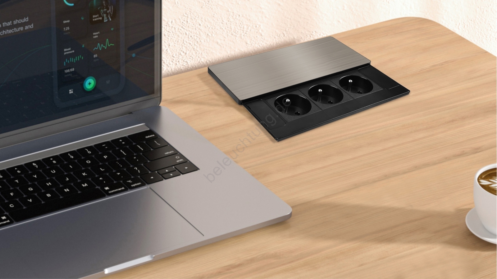 • Ein Einbau-Steckdosenblock mit Schiebedeckel, geeignet zur Montage in Arbeitsplatten oder Schreibtischen.