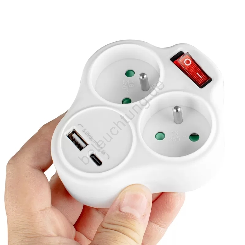 • Zweifach-Verteiler für französische Steckdosen mit Erdung und Schalter + USB-C + USB-A.