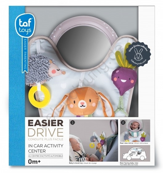 • Spielbrett mit hängenden Stoffspielzeugen und wunderschönen Illustrationen aus dem Gartenleben unterhält Kinder während der Autofahrt.