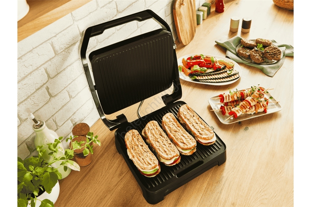 • Kontaktgrill „2-v-1“: vereint die Funktionen eines Panini-Makers und eines klassischen Grills – so gelingen Sandwiches, Fleisch, Gemüse und größere Portionen besonders einfach.