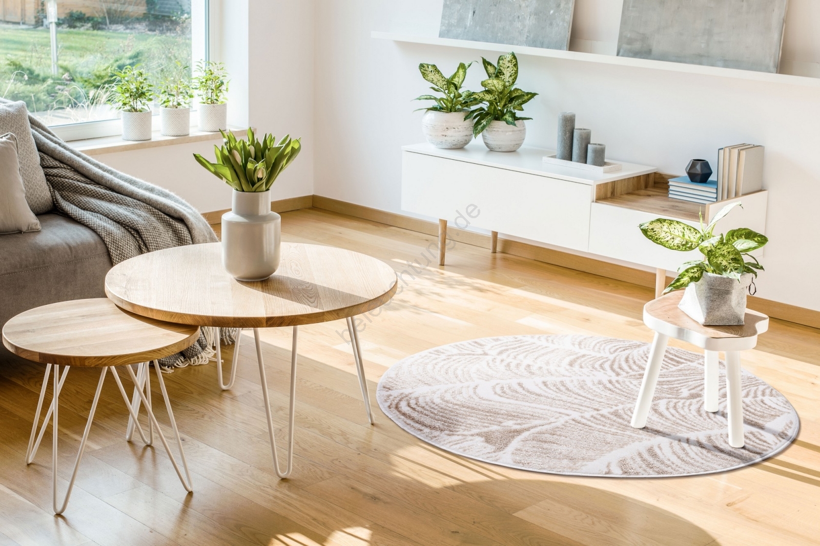 • Ein zarter beiger Teppich mit dezentem Blattmuster verleiht jedem Raum einen Hauch von Leichtigkeit und Behaglichkeit.