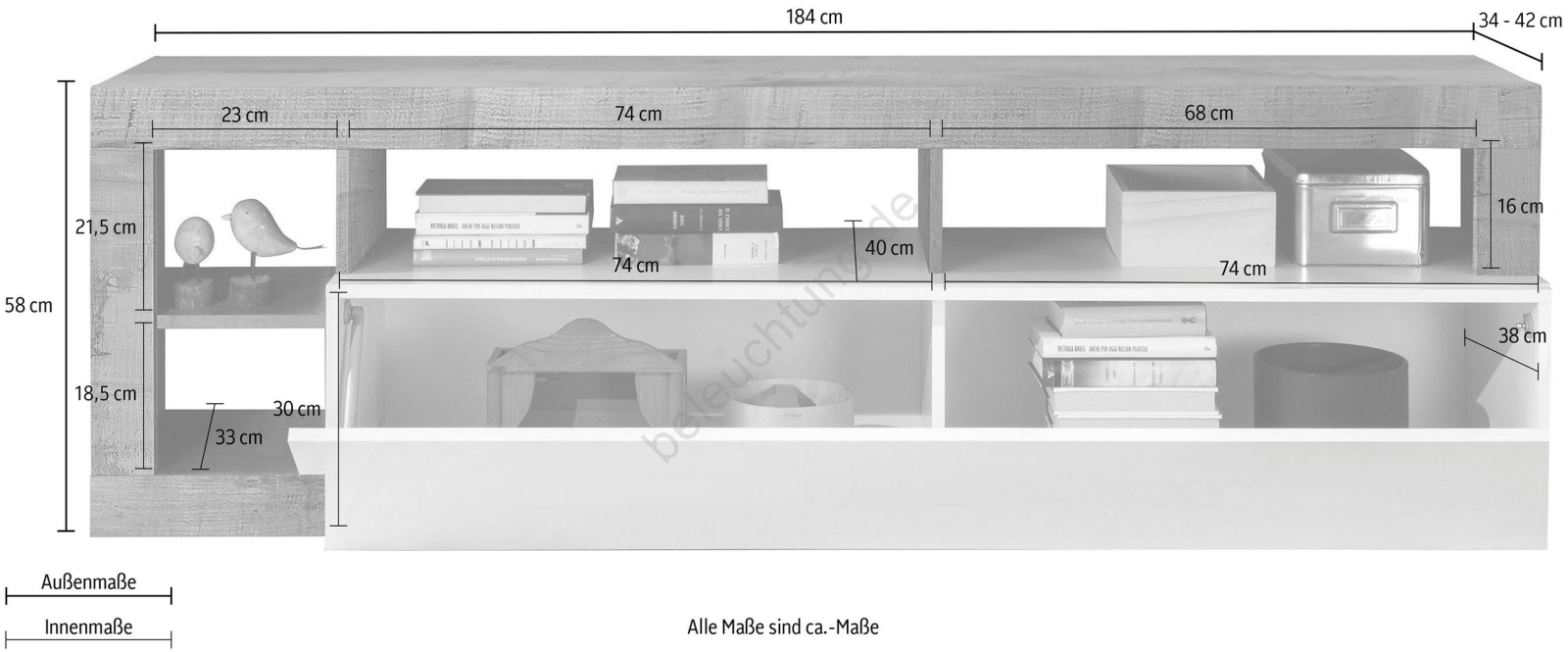 • Unteres Fach und offene Regalfächer bieten Platz für Bücher, Dekorationen und Haushaltsgegenstände.