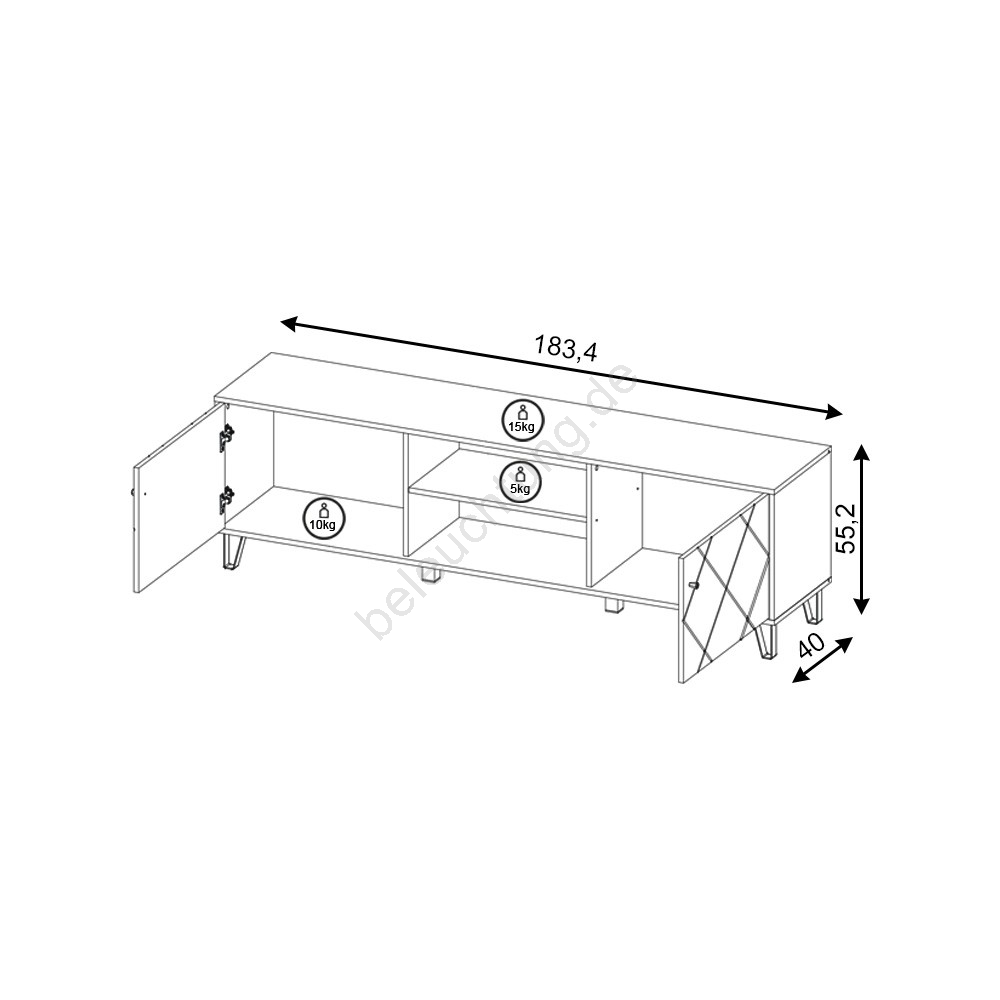 • Er verfügt über zwei geschlossene seitliche Fächer, jeweils mit einer Tür mit dekorativer diagonaler Verzierung, sowie zwei offene Regalfächer in der Mitte mit Kabeldurchlass.