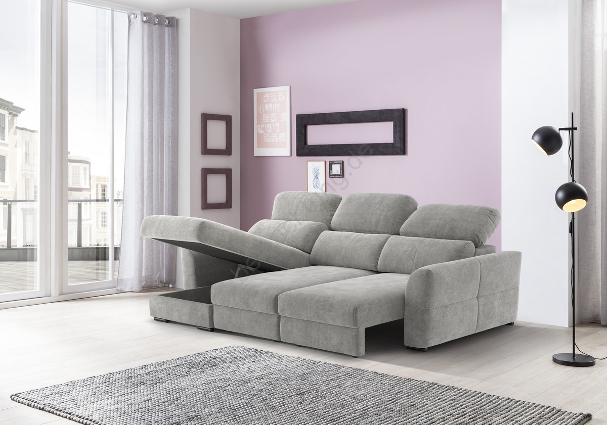 • Beidseitig montierbares, ausziehbares 3‑Sitzer-Ecksofa mit Stauraum TRENTO, hellgrau