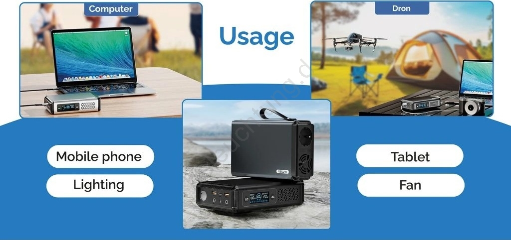 • Vielseitig einsetzbar dank verschiedener Ausgänge (USB-C, USB-A, DC-Anschluss 5521, AC230V).