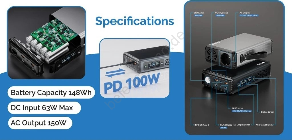 • USB-C Eingang/Ausgang: 5V/9V/12V/15V/3A, 20V/5A 100W max.