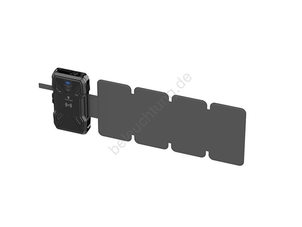 • Dank des innovativen klappbaren Solarmoduls können Sie Ihre Geräte mit Sonnenlicht aufladen und haben so Ihr Telefon, Tablet oder andere Elektronik stets einsatzbereit.