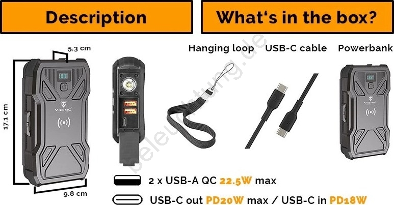Viking - Powerbank mit integrierter LED-Taschenlampe, kabelloser Ladefunktion und Solarpanel, Power Delivery 22,5 W / 20000 mAh