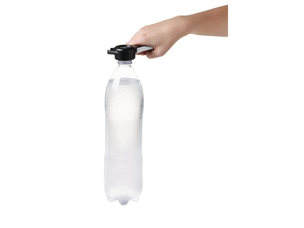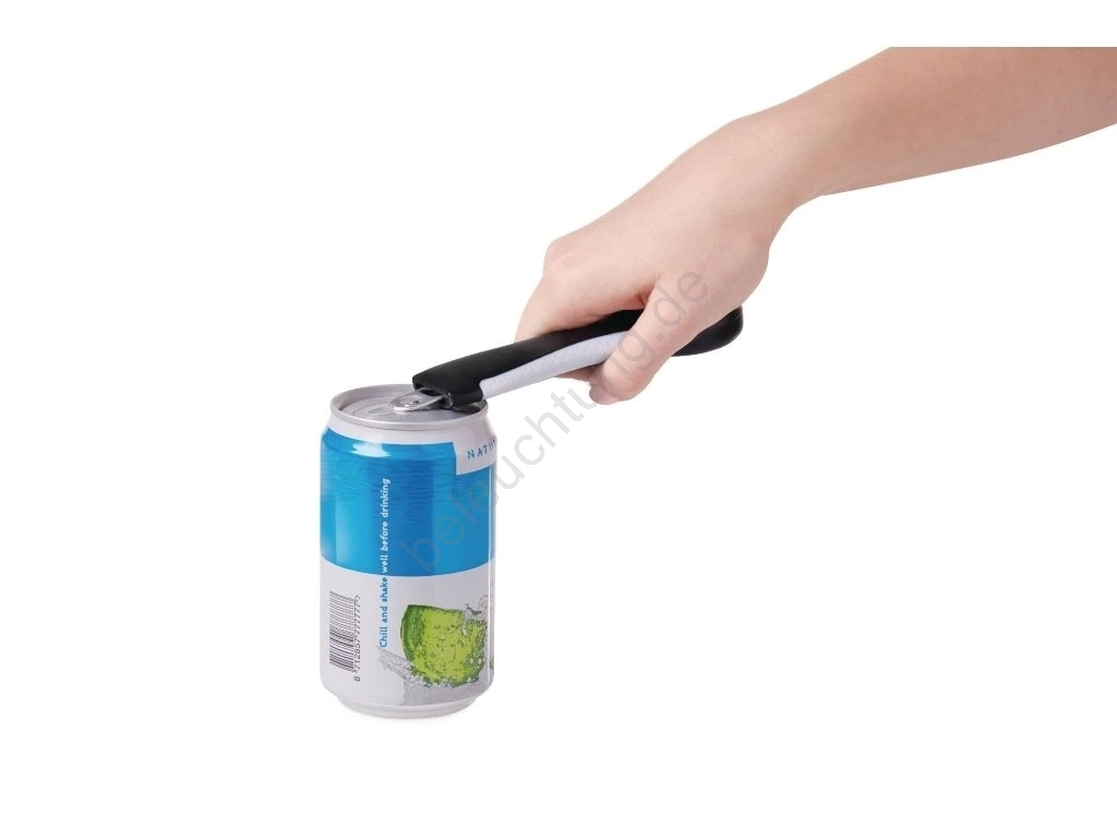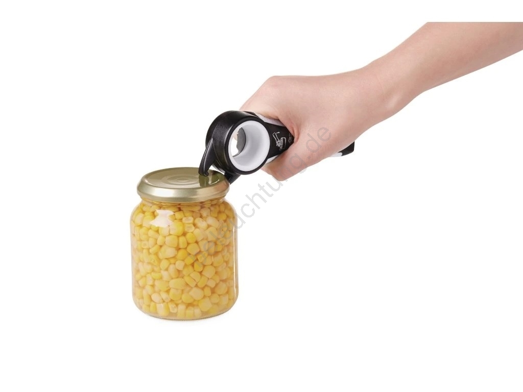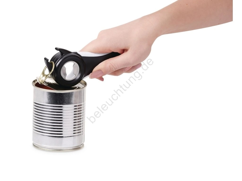 • Dank seines Designs meistert er fünf verschiedene Aufgaben: das Öffnen von Dosen bzw. Konserven, das Entfernen von Deckeln von Einmachgläsern (Twist-off), das Abnehmen herkömmlicher Kronkorken von Glasflaschen sowie das Lösen von Schraubverschlüssen an PET-Flaschen.