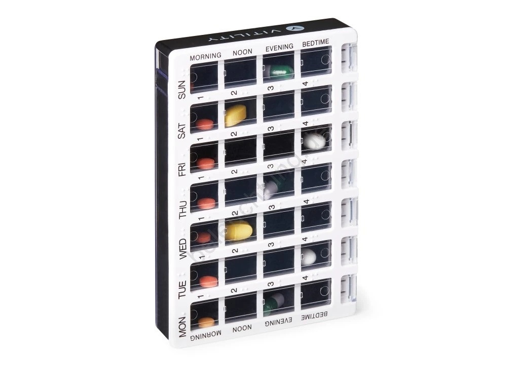 • Die wöchentliche Medikamentenbox Vitility ist ein umfassender Dosierer, der für eine übersichtliche und zuverlässige Organisation Ihrer Medikamente für die gesamte Woche konzipiert wurde.