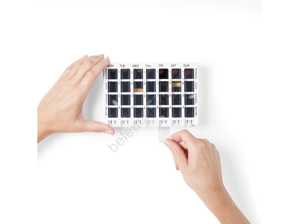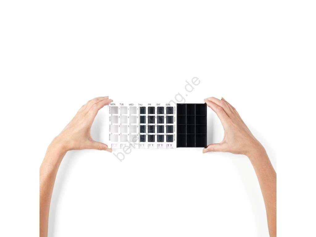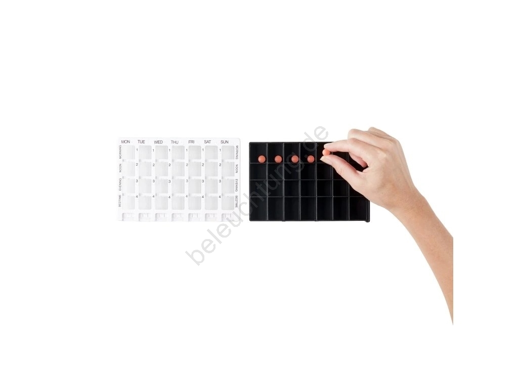 • Der Organizer ist in ein System aus 7 Spalten (Wochentage) und 4 Reihen (Tageszeiten) unterteilt, was insgesamt 28 separate Fächer ergibt.