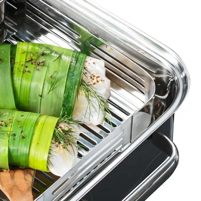 • Dampfgaraufsatz und Rost ermöglichen die Zubereitung ohne Wasserberührung – erhalten Vitamine und Geschmack.