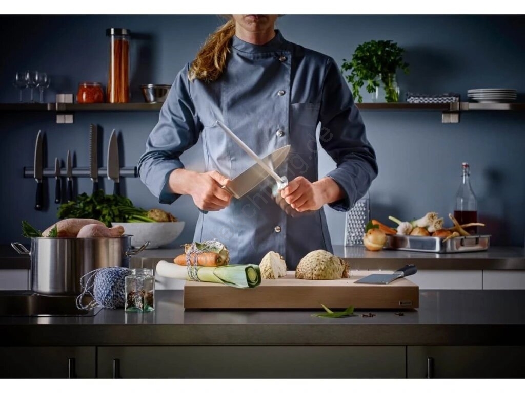 • Mehrere Züge auf beiden Seiten der Klinge mit dem Wetzstahl helfen, die Schärfe einer hochwertigen Klinge zu erhalten.